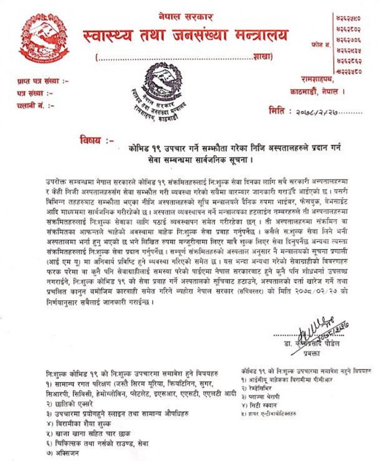संक्रमित वा संक्रमितका आफन्तले सःशुल्क सेवा लिने भनी अस्पतालसँग लिखित रुपमा मञ्जुरीनामा गरेको अवस्थामा मात्रै सःशुल्क उपचारको व्यवस्था गर्न निजी अस्पतालहरुलाई मन्त्रालयले भनेको छ ।