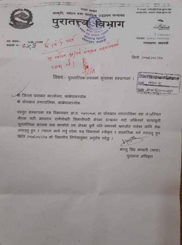 पुरातत्व विभागले २०७६ मंसिर २७ गते जिल्ला प्रशासन कार्यालय काभ्रेलाई पत्र लेख्दै पाँचखाल नगरपालिका ७ मा अनुमतिविना खनजोत गर्न रोक लगाउन भनेको थियो । जिल्ला प्रशासन कार्यालयले सोही बमोजिम गर्न पाँचखाल नगरपालिकालाई पत्राचारसमेत गर्यो । तर, नगर प्रमुख खरेलले त्यसलाई बेवास्ता गरे, जसका कारण अहिले पनि उक्त क्षेत्रमा निर्वाधरुपमा इँटा भट्टा चलिरहेका छन् । पाँचखालमा रहेको एउटा इँटा उद्योग भगवती ब्रिक फ्याक्टी« मा खरेलले अप्रत्यक्षरुपमा लगानीसमेत गरेको स्थानीयबासीको आरोप छ । स्थानीयबासीले खरेलको सेलिब्रेटी फण्डा बुझेरै होला यसपटक नयाँ नेतृत्वको चाहना राखेका छन् ।