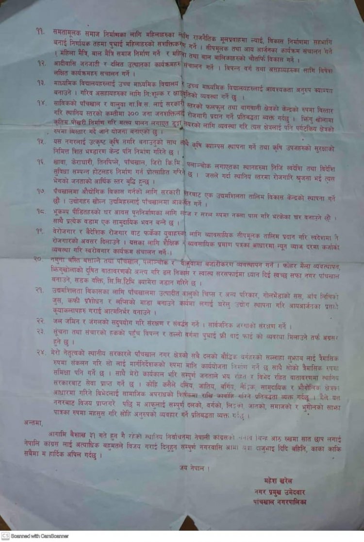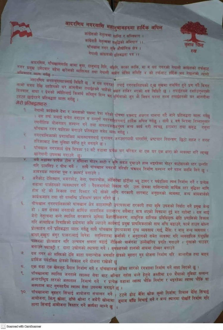 हामीले खरेलको चुनावी पर्चा पनि सँगै राखेका छौं । पर्चामा उल्लेख भएअनुसार खरेलले आफ्नो पुरै कार्यकालमा प्रतिवद्धता अनुसारको केही काम नगरेको पाईयो । खाली संघ र प्रदेश सरकारले हालेका योजना र वजेटहरुमा फित्ता समायर घुम्ने र मिडियामा प्रचारवाजी गर्ने गरेको मात्रै पाइएको छ ।