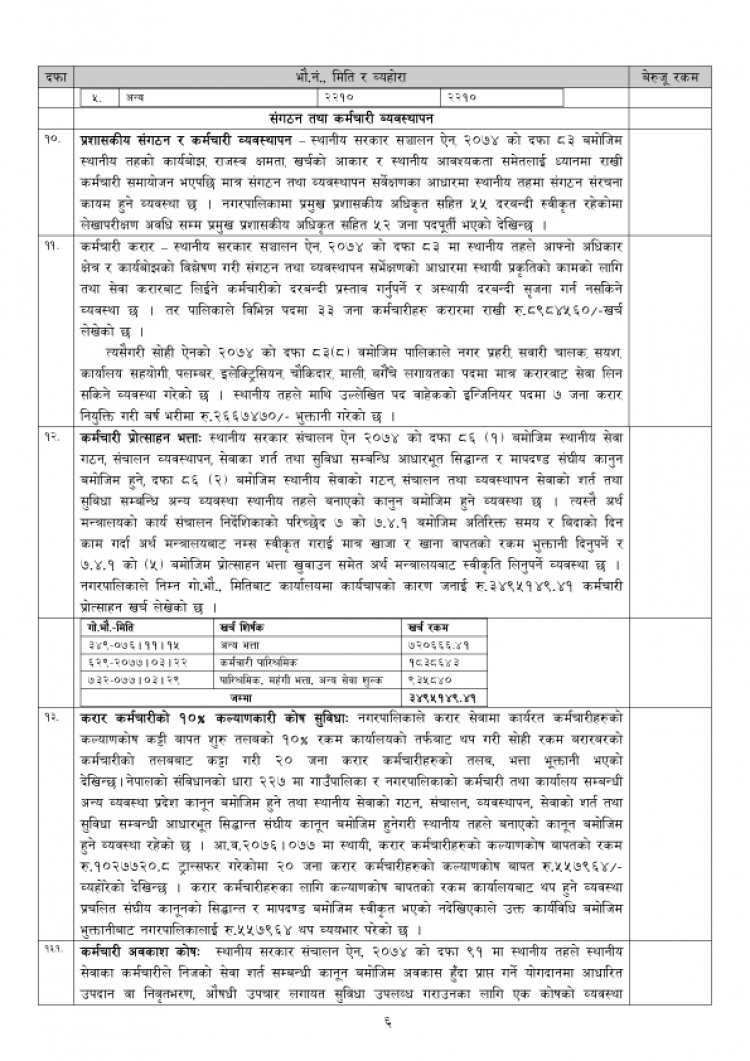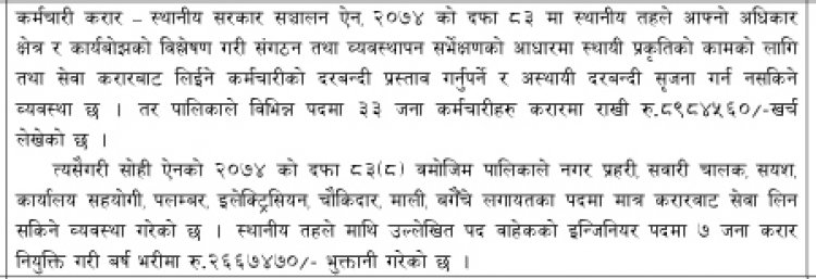 स्थानीय सरकार सञ्चालन ऐन २०७४ को दफा ८३ मा स्थानीय तहले आफ्नो अधिकार र कार्यबोझको विश्लेषण गरी संगठन तथा व्यवस्थापन सर्भेको आधारमा स्थायी प्रकृतिको कामको लागि तथा सेवा करारबाट लिइने कर्मचारीको दरवन्दी प्रस्ताव गर्नुपर्ने र अस्थायी दरबन्दी सिर्जना गर्न नसकिने व्यवस्था छ । तर, त्यसविपरित नगरपालिकाले ३३ जना कर्मचारी करारमा राखेको महालेखाले औंल्याएको छ । सोही ऐनको दफा ८३ (८) बमोजिम पालिकाले नगर प्रहरी, सवारीचालक, सशय, कार्यालय सहयोगी, प्लम्बर, इलेक्ट्रिसियन, चौकीदार, माली बगैचे, लगायतका पदमा मात्र करारबाट सेवा लिन सकिने व्यवस्था गरेको छ । त्यसविपरित खरेलले ७ जना इन्जिपनयरलाई करारमा नियुक्त गरेका छन्, जसका लागि नगरपालिकाबाट २६ लाख ६७ हजार ४७० रुपैयाँ खर्च भएको छ ।