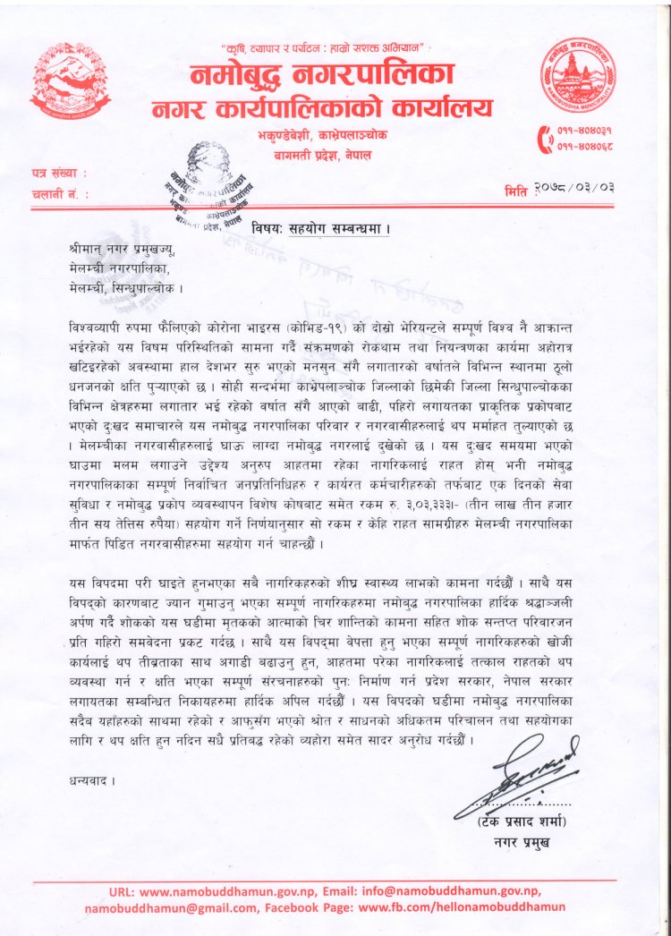 नमोबुद्ध नगरपालिका नगर प्रमुख टिपी शर्मा तिमल्सिनाले मेलम्ची नगर प्रमुखलाई पठाउनुभएको लिखित सन्देश